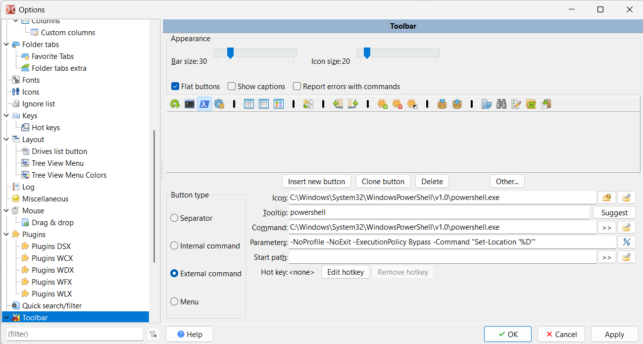 | Powershell | Icon : C:\Windows\System32\WindowsPowerShell\v1.0\powershell.exe Tooltip : powershell Command : C:\Windows\System32\WindowsPowerShell\v1.0\powershell.exe Parameters : -NoProfile -NoExit -ExecutionPolicy Bypass -Command "Set-Location '%D'" Start path : なし |