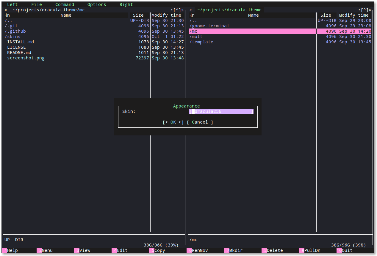 1. /home/taka/.local/share/mc/skins に skinを置く